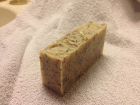This is it cut and cured for a few weeks. This bar also has coconut oil, castor oil and and olive oil, in a goats milk base. The poppy seeds and lemon peel granules make it scrubby. It's a great soap for the kitchen.