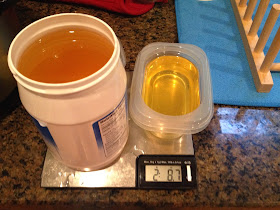 I transferred this to a couple of containers on the scale to see how much was left. You should make sure your containers are heat tolerant or risk melting them like I did! The big container was fine,. The little storage container began to buckle and warp. Luckily, I just wanted to measure it and could pour it into another container after quickly snapping a picture!