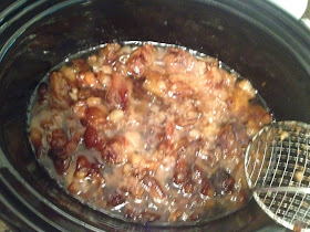 I started to try to trim the little bits, separating the meat from the fat, but quickly decided that was a phenomenal waste of my time! I had no plans for the microscopic bits of meat I was trimming off, except to give the dog a happy treat, and it was going to take hours!  Instead, I just dumped the whole mess into my crock pot. You can see that the crock pot is nearly full of scraps.